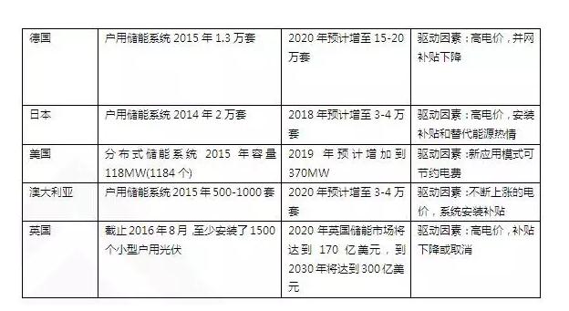 根据IHSHtechnology发布的报告预测至2018年,户用光伏储能容量将达到900MW。美国、日本、德国、澳大利亚和英国作为传统的光伏储能强国在技术开发储备,政策导向、市场开拓等方面领先于其他国家和地区,表1 概述和预计上述5个国家户用光伏储能信息。