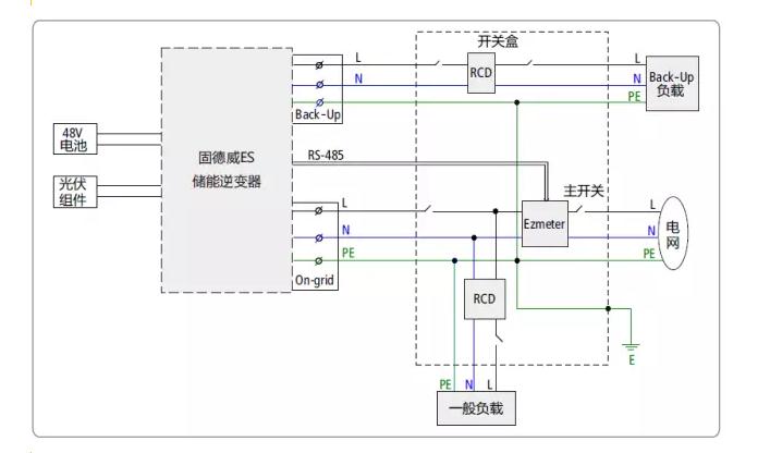 基于ES的完整双向储能系统包括:光伏组件,储能电池,EM逆变器,电网,配电箱,采集并网信息EzMeter(作为附件由GOODWE提供)和电网。