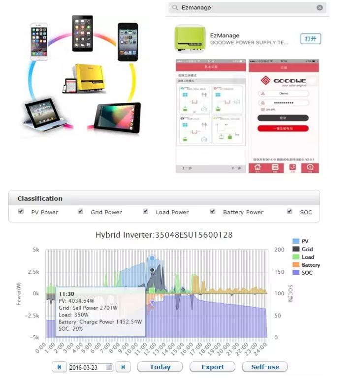 储能系统的运行过程是一个电源和负载动态优化的过程,在平衡的过程中,各个部件的运行参数时刻变化,为了让用户更加清晰便捷地了解储能电站的运行,固德威为用户开发了两种监控方式:便捷的本地监控-手机应用EzManage和全面完整的网络监控。
