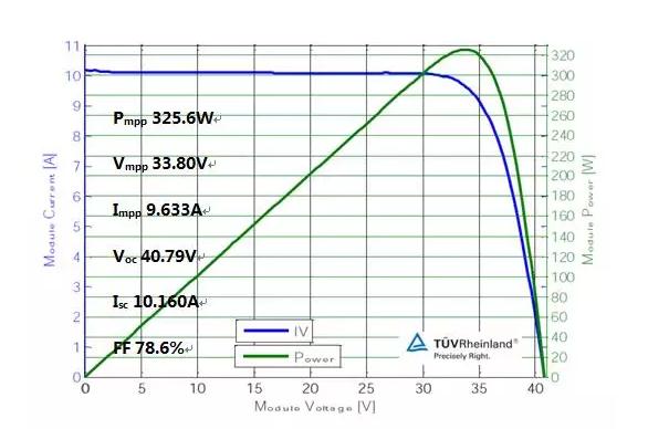 该组件选用基于量产技术、光电转换效率为21.90%的单晶PERC电池,于4月17日在TÜV莱茵上海实验室完成测试,组件开路电压与短路电流分别达到40.79V 与10.160A。