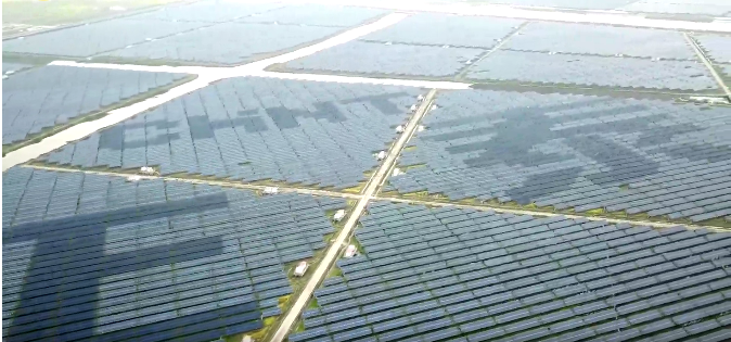 这一片片光伏板沉浸在热烈的金色里,彼此浪漫相拥,宛如花海中的一面面“明镜”,又像金色的沙滩泛着海水的点点光亮,微风吹过,金浪滚滚,蓝海滔滔,那扬起的一朵朵明黄浪花,在光伏组件的蓝色海洋里翩然起舞,尽情享受阳光的滋润。