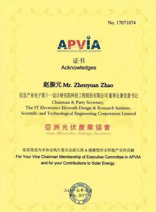 赵振元同志当选亚洲光伏产业协会(APVIA)执行委员会副主席、十一科技加入亚洲光伏产业协会(APVIA)