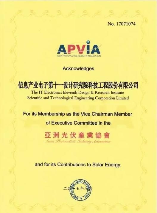 十一科技加入亚洲光伏产业协会(APVIA)入会证书