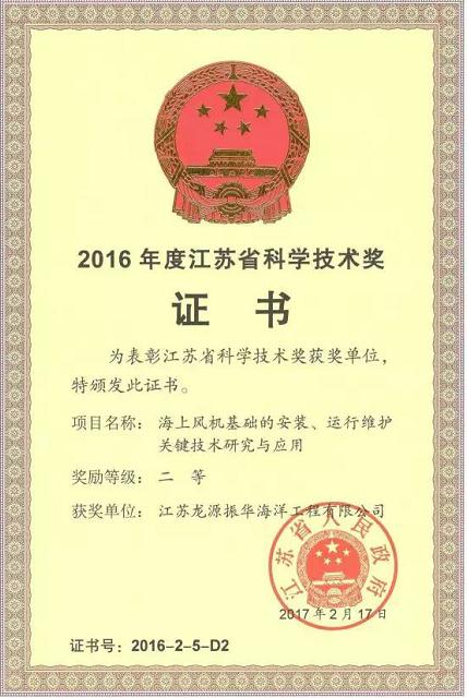 龙源振华凭借“海上风机基础的安装、运行维护关键技术研究与应用”荣获“2016年度江苏省科学技术奖”二等奖。