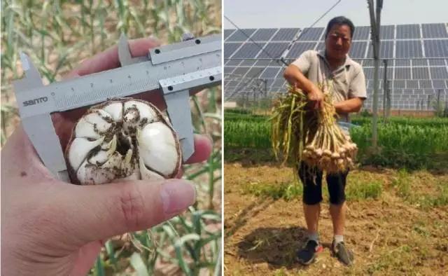 6月8日,在邢台任县,种植在光伏电站的75亩大蒜喜获丰收,初步测产大蒜亩产1700斤/亩(折合干蒜)。该批大蒜在2016年10月栽植在光伏电站组件区域,利用了组件下和组件间的空间,实现板上发电,板下种植,提高了土地利用效率和综合收益。