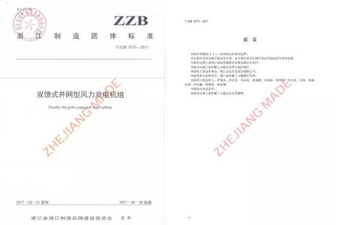 近日,由运达风电主持制定的“浙江制造”团体标准T/ZZB 0173—2017《双馈式并网型风力发电机组》正式发布,该标准由浙江制造品牌促进会提出,浙江省机械工业联合会归口。