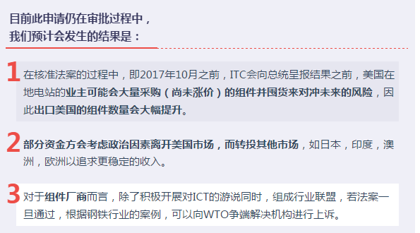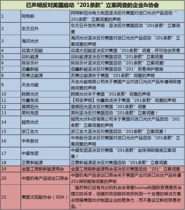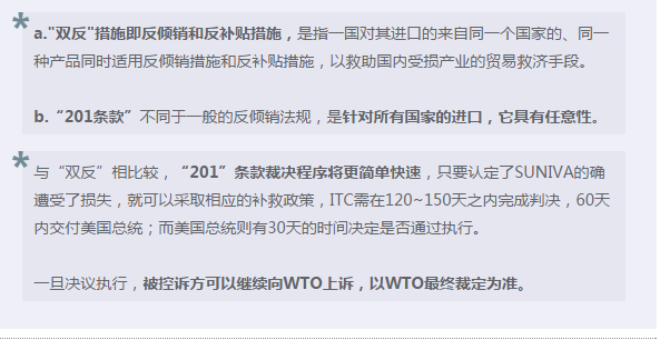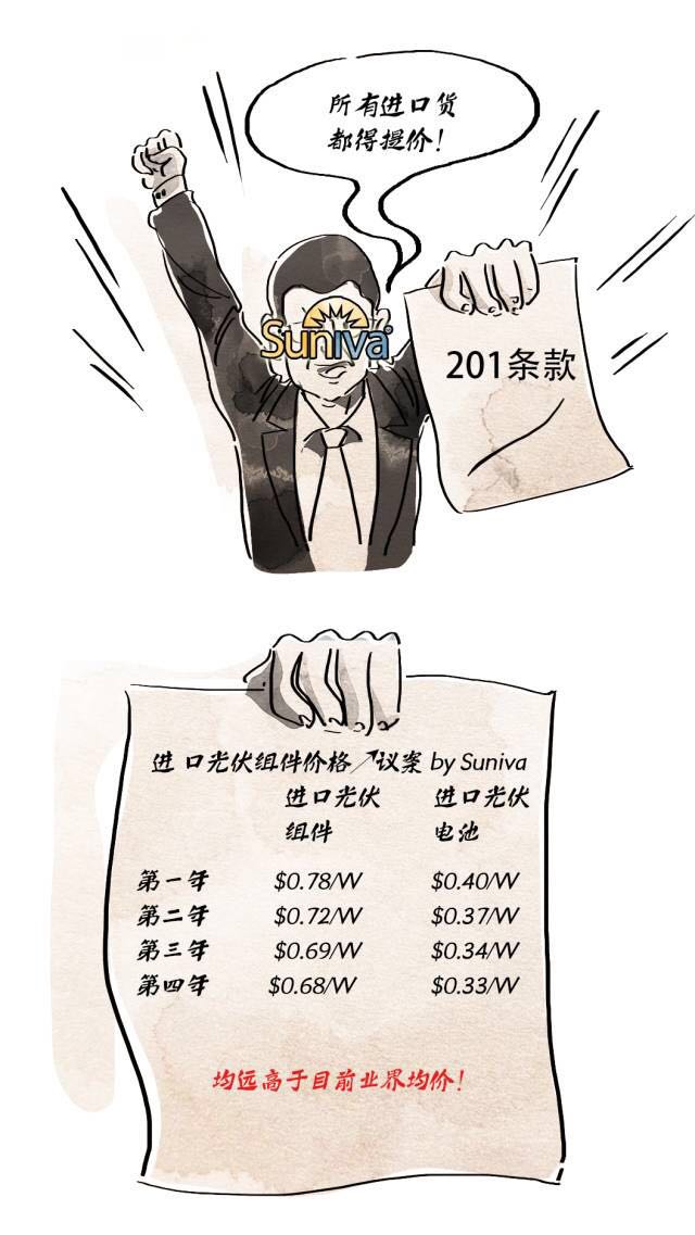 4月17日,总部位于美国乔治亚州的光伏电池和组件制造商Suniva正式向美国法院申请破产保护。26日,该公司随即以《1974年贸易法》的“201”条款为依据,向美国国际贸易委员会提起诉讼,要求对所有进口至美国的晶硅光伏电池片和组件发起全球保障性措施调查。