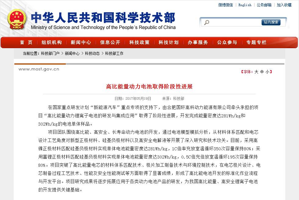 【导语】据科技部官网5月19日消息,在国家重点研发计划新能源汽车重点专项的支持下,由国轩高科牵头承担的项目“高比能量动力锂离子电池的研发与集成应用”取得了阶段性进展,开发完成能量密度达281Wh/kg和302Wh/kg的电池单体样品。
