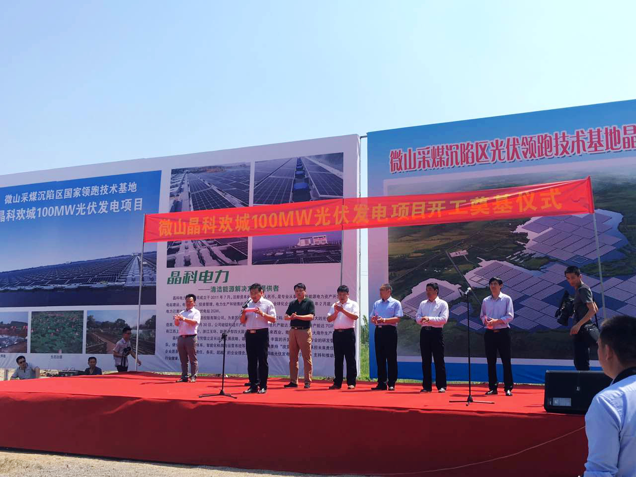 近日,由晶科电力投资的微山采煤沉陷区光伏领跑技术基地——欢城100MW渔光互补光伏发电项目奠基开工仪式在山东省济宁市微山县隆重举行,现场气球高悬,鞭炮齐鸣,热闹非凡,晶科电力CEO乔总等出席了本次开工仪式。