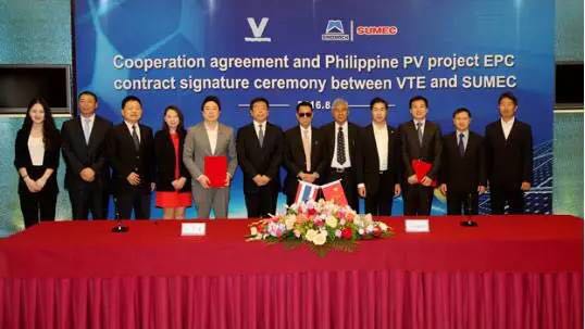 2016年苏美达能源与泰国著名上市公司——VTE达成全面合作。此次合作进一步深化了双方的战略合作关系,双方将以此次合作为新的契机,充分发挥各自优势,在东南亚可再生能源市场展开深度合作,陆续展开光伏、地热、风电,生物质能、水电等一系列可再生能源项目业务,其中菲律宾25兆瓦光伏项目作为双方合作的开篇,已经动工。