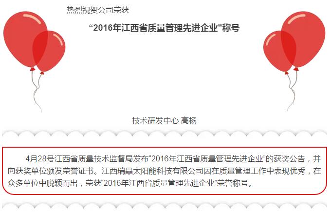 瑞晶公司荣获“2016年江西省质量管理先进企业”荣誉称号