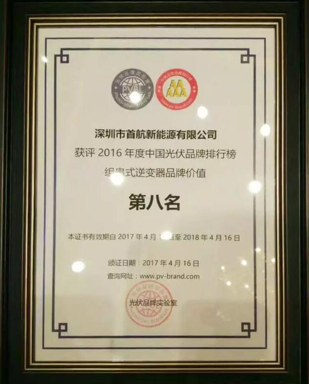 近日,“2016年度中国光伏品牌排行榜”在上海“2017世纪光伏大会”上隆重发布,深圳市首航新能源有限公司(以下简称“首航新能源”)凭借这几年在行业中的骄人的逆变器出货量以及外部综合指标等,在众多企业中脱颖而出,被评为“2016年度中组串式逆变器品牌价值奖”。