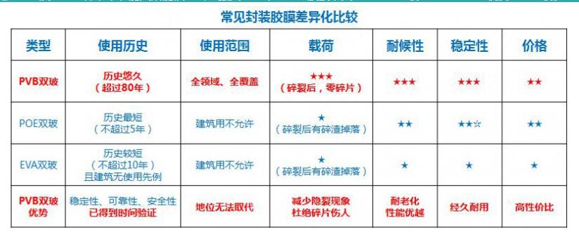 目前市场上晶硅双玻组件产品中使用的胶膜主要是POE及EVA两种,中节能太阳能镇江公司独具创新采用PVB胶膜,其特色PVB双玻组件比POE双玻及EVA双玻优势显著: