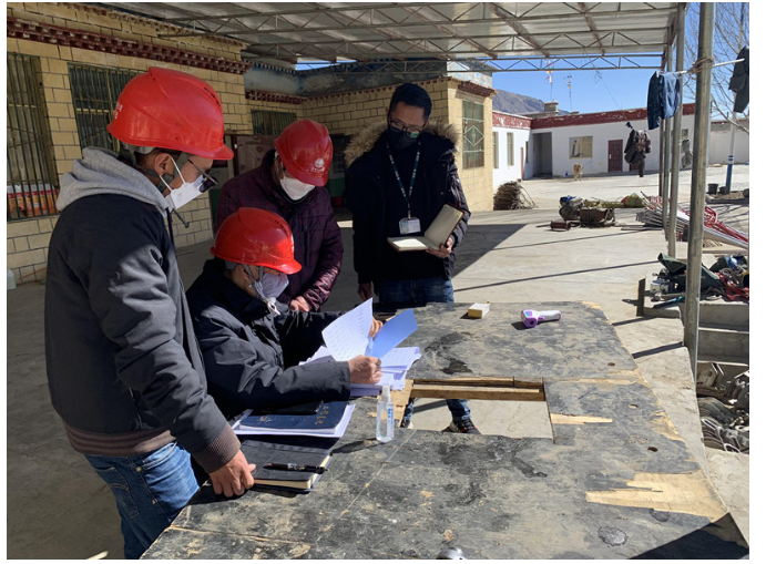 国网江苏电力援藏帮扶人员现场查看施工人员名录和解除隔离证明,检查防疫防控措施落实情况。