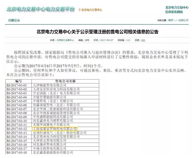 近日,经过爱康集团旗下子公司上海爱康富罗纳售电有限公司上下齐心协力,其在北京电力交易中心申报的售电公司注册申请中喜获通过,现已进入公示阶段。待公示期满后,爱康售电公司将正式获得准入,具备电力交易资格。北京交易中心还将通过审批的售电公司名单推送至河北、冀北、山东、甘肃、新疆、江西、蒙东等7个省级电力交易中心,因此爱康售电公司同时具备了以上省级电力市场的交易资格。