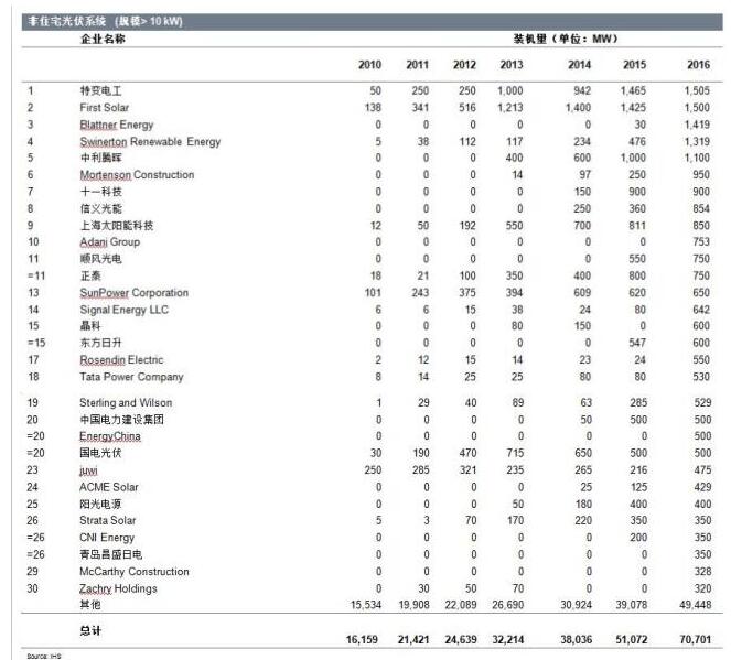 值得注意的是,在2016年,排名前30的光伏系统集成商安装了全球30%的非住宅光伏项目。