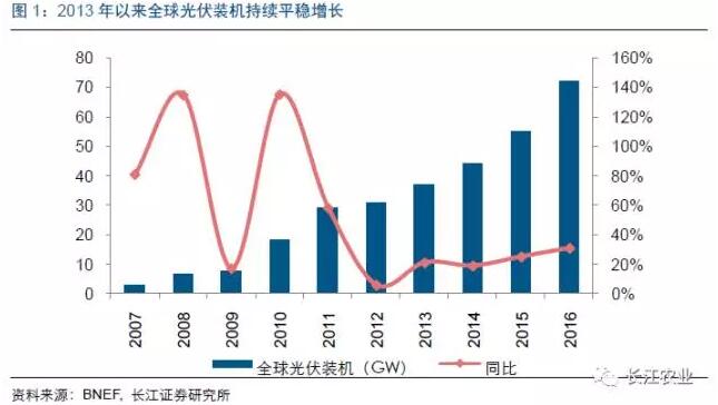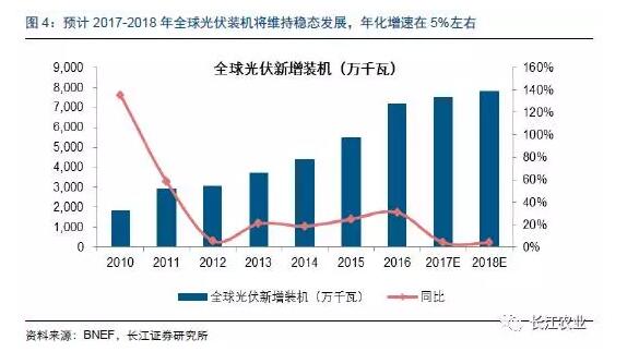 整体来看,我们认为后期全球光伏需求仍将维持稳定增长趋势,预计2017、2018年全球光伏装机有望达到75、80GW,年化增长5%左右。