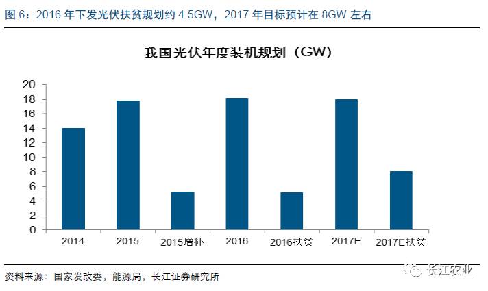 另一方面,随着光伏扶贫模式逐步清晰、精准扶贫效果日益显现等,我国明显加大对光伏扶贫支持力度,2016年下发光伏扶贫规划约4.5GW,2017年目标预计在8GW左右,光伏扶贫的快速增长同样将为国内光伏行业装机提供保证,预计后期国内光伏装机仍将维持平稳发展趋势。