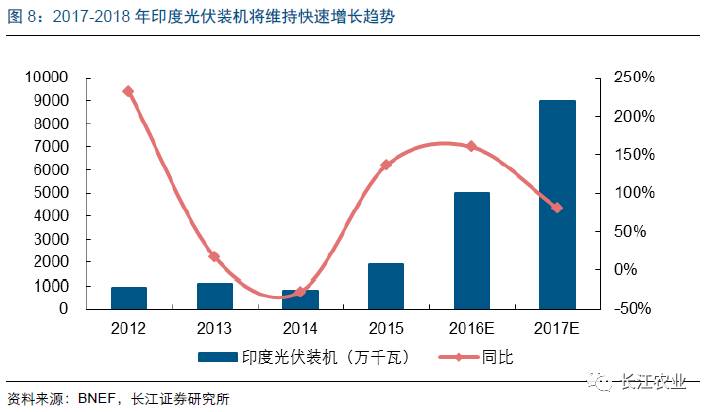 印度市场是后期全球光伏主要的新增市场之一,受益于政策支持,2015年印度实现光伏装机约2GW。根据Bridge to India相关数据,预计2016印度装机将达到4.8GW以上,2017年装机有望冲击8-10GW水平。