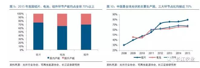 我国作为全球光伏产业链的主要生产国,2006年以来产业链市占率持续提升。目前,不管是硅片,还是电池组件,均在全球占据主力地位。根据可再生能源协会的数据,2015年我国硅片、电池、组件产能占比均超过70%,产量分别占到全球的79.60%、67.72%、66.02%。
