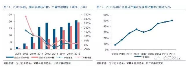 然而,相比于硅片-电池-组件产业链,国内多晶硅产业发展相对滞后,2008年以前国内多晶硅产量占全球产量不足10%,导致国内光伏产业长期受制海外硅料企业。此后,国内企业开始加速布局多晶硅产能,带动国内多晶硅产量及占比持续提升,2016年国内多晶硅产量19.3万吨,占世界总产量的50.26%。
