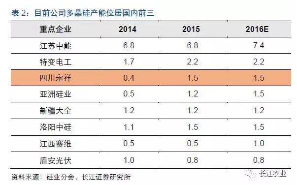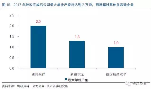 公司作为国内多晶硅龙头企业,是国内七家万吨级多晶企业之一。截止2016年底,公司具备多晶硅产能1.5万吨,2017年通过技改有望进一步扩产至2万吨,产能规模位居国内前三。