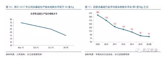 成本方面,公司多晶硅产能布局四川省乐山市,一方面乐山市为我国多晶硅生产发源地,具备完成的工业硅生产产业链,使得公司可以以更低的价格获取原材料;另一方面,四川省水电资源丰富,电价水平较低,从而使得公司在本就较低的综合电耗水平下,获取更低的多晶硅生产电费成本。同时,公司具有完善的精细化管理体系,从细节入手,进一步降低成本。根据公司数据,2016年底公司多晶硅生产成本已降至6万/吨以下水平,处于行业领先水平。
