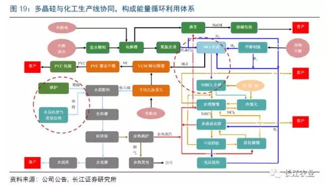 除在多晶硅生产领域深耕细抓之外,公司积极通过产品外延协同等手段,进一步降低公司多晶硅生产成本。目前,除多晶硅产线外,公司还拥有PVC产能12万吨、烧碱产能10万吨、水泥产能100万吨。通过多晶硅与化工的联营,形成从盐卤、氯化氮、烧碱、PVC、多晶硅到电石渣水泥的完整循环经济产业链,降低综合生产成本。