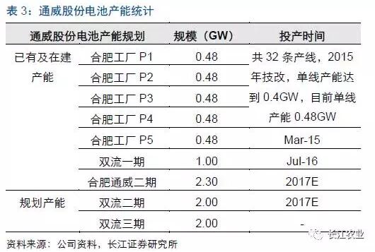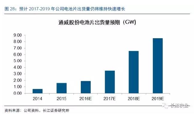 电池业务方面,2016年公司完成收购合肥通威后,电池产能达到2.3GW左右水平。在进行合肥通威并购的同时,公司推进成都双流电池基地建设,一期产能1GW在2016年7月实现提前投运,使得公司电池产能达到3.3GW水平。