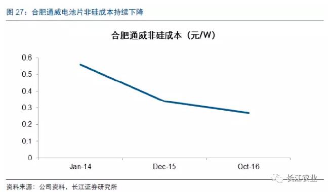 除长期积累的技术优势外,公司注重成本管控,通过持续的精细化管理,降低电池生产成本,进一步增强公司竞争力。2016年末公司电池生产非硅成本仅0.27元/W,较2015年底的0.34元/W水平大幅降低,且明显低于行业平均水平。
