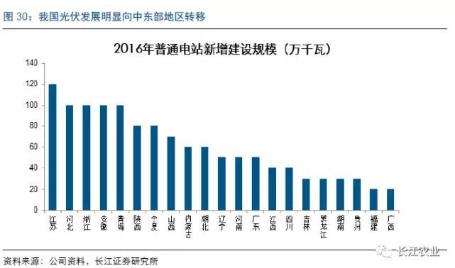 在此背景下,2016年开始我国积极推动风电、光伏向中东部地区发展,尤其是对资源依赖较低的光伏电站。从2016年我国光伏规划指标分配来看:1)限电相对严重的新疆、甘肃停止或暂缓下达2016年光伏建设规模(光伏扶贫除外);2)山东地区普通光伏电站新增建设规模全部用于光伏扶贫。3)中东部地区的江苏、浙江、安徽、河北普通光伏电站规模均超1GW,无限电的中东部地区项目占比超过70%。