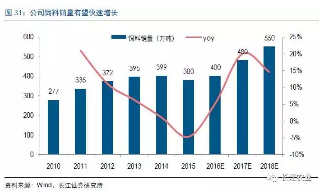 我们认为,今年水产料行业或迎来复苏,公司作为水产料行业龙头企业,其竞争优势有望凸显,从而充分受益。具体来看:1、行业层面在今年暖冬的背景下,水产料投放时期将较去年有所提前,且今年年初以来鱼价平均增幅达17.3%,水产料需求有望大幅提升;2、公司作为水产料行业龙头,有望充分受益此次水产料行业回暖,其技术优势以及养殖配套服务体系在行业复苏时有望攫取更大的市场份额,且依靠渔光一体化及互联网营销模式逐步推广,销售渠道进一步打开。整体预计17,18年饲料销量或达480和550万吨。