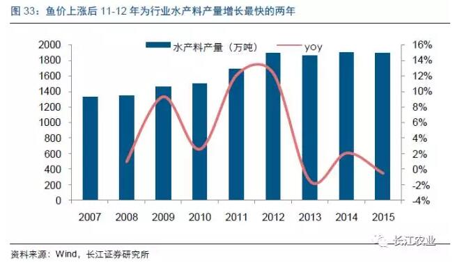 我们判断,今年水产料行业或迎来复苏。主要基于以下两点:1、受益于今年暖冬天气影响,预计今年投苗时间将较去年提前约1个月(去年由于寒潮原因集中投苗时间延至5月份),从而使得饲料投放时长有所增长,带动销量的上行;2、今年起鱼价开始大幅上行,主要原因在于去年7,8月份的洪灾使得今年整体的鱼供应量减少,年初至今平均鱼价已上涨17%,部分品种接近30%涨幅。在鱼价大幅上涨的背景下,水产料的投放量有望出现大幅提升,从历史数据来看,10年洪灾后11鱼价上涨,从而带动行业整体的需求量当年增长12%,达近10年来最高值,也进一步验证了在鱼价景气时期水产料需求量或出现大幅增长。