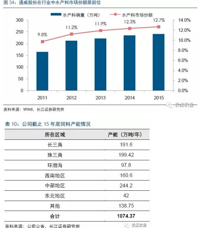 我们认为,公司作为国内水产料行业龙头,有望在此次行业复苏的背景下充分受益。主要基于以下几点:1、公司目前水产料市场份额居行业前列,15年占比即达12.7%,在今年整体水产料行业或迎来复苏的背景下有望充分受益,且公司产能方面已达1075万吨,充分的保障了在行业回暖时期公司饲料的供应;2、公司深入耕耘水产料行业二十年,已储备了深厚的水产行业的技术,在苗种的供应以及水产疾病的防疫上优势突出。因此在现阶段行业复苏时期有望依靠苗种-饲料-防疫-服务一体化的模式拓展更多的客户;3、公司近年来打造互联网营销渠道模式。通过通心粉微信公众号及app实现养殖用户的深度绑定,且在进军光伏产业后,通过渔光一体的模式可实现养殖户生产要素资料的高度绑定,对于饲料销量的稳定提升将重要支撑作用。整体上我们预计公司2017,2018年的饲料销量有望达480和550万吨。