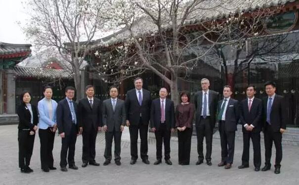 中环电子集团总经理曲德福(右1),东方电气集团党组书记、董事长邹磊(左1),会见法国道达尔集团董事长兼首席执行官潘彦磊(中)