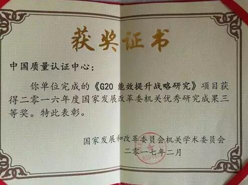 中国质量认证中心《G20能效提升战略研究》项目获国家发改委研究成果奖项