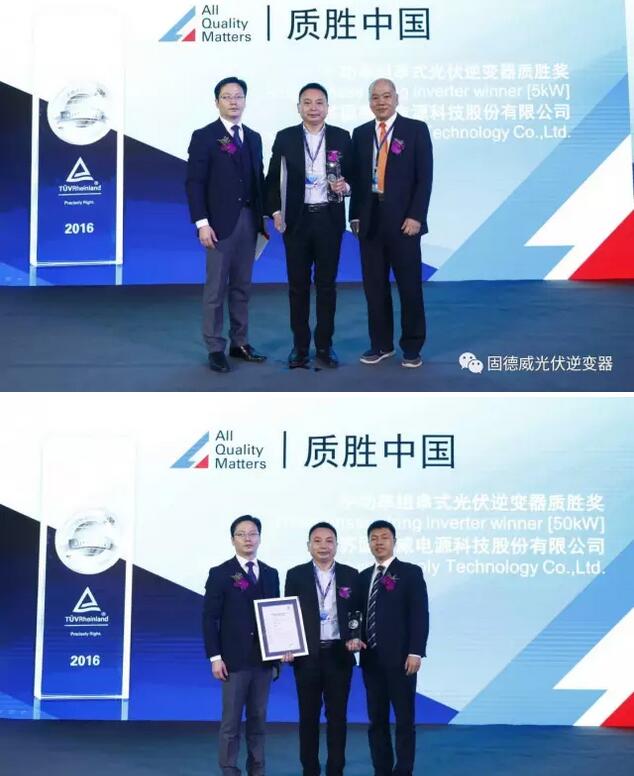 在当天“质胜中国优胜奖”的颁奖盛典上,固德威凭借毫无争议的性能优势,荣获“小功率组串式光伏逆变器质胜奖”和“中功率组串式光伏逆变器质胜奖”两项大奖,这是继固德威2016年在嘉兴“质胜中国”典礼上荣获户用及储能两项优胜奖之后,再次同时斩获双项冠军。
