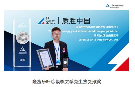 TÜV莱茵“质胜中国”光伏盛典昨日在无锡拉开帷幕,备受业界关注的2017“质胜中国优胜奖”榜单正式出炉,获得“质胜中国优胜奖”,即证明该产品拥有卓越的质量。作为最受关注的“光伏组件发电量仿真优胜奖”压轴发布。在模拟了德国科隆、中国大同、日本熊本、印度金奈、美国洛杉矶五个地区环境,经历严格严苛的实测之后,完成了“光伏组件发电量仿真竞赛”的发电量测试。最终,乐叶光伏60片单晶组件以实际发电总数据第一的成绩获得单晶组第一名,获得“光伏组件发电量仿真优胜奖”单晶唯一奖项;同时也以全部组件中第一名的成绩证明了其单晶组件发电能力的先进性。
