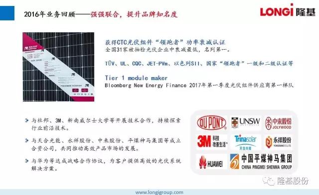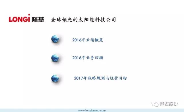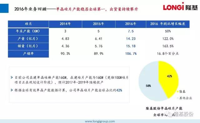 2016年,隆基股份始终专注于单晶技术路线,持续加大研发投入,秉持“可靠、增值、愉悦”的企业文化,为客户提供不断增值的产品,为员工创造愉悦的工作环境,低调稳健向前发展,做全球客户值得信赖的合作伙伴。在所有隆基人的不懈努力下,2016取得骄人业绩。