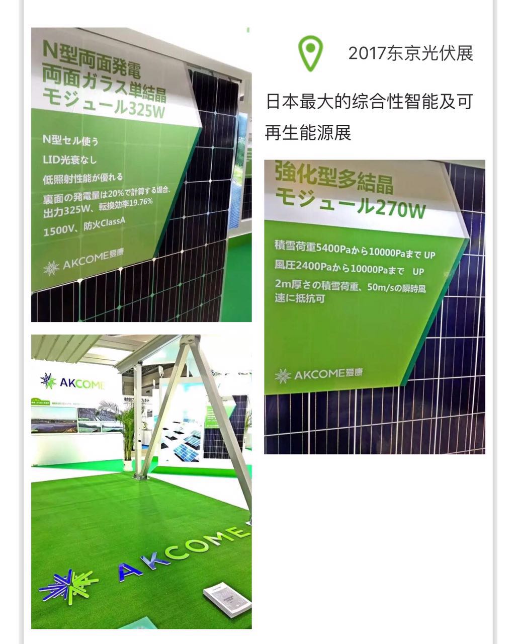 3月1日—3日,爱康组件及支架新品在2017日本东京光伏展上夺目亮相,吸引到日本、亚洲乃至全球专业人士的目光。正反面均可承载10000Pa压强的强化组件、水面电站专用组件、双面发电双玻组件以及新型倾角可调全铝车棚系统,这些历经多时潜心研发的科技新品,一跃登上国际化大平台,是爱康追求卓越的印证,也是世界对爱康实力的认可。