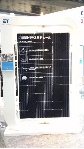 此次展出的双面双玻光伏组件采用双面电池片。双面电池的背面可吸收反射和散射的日光,从而有效提升发电量。