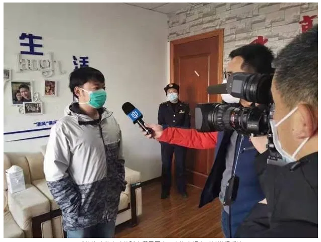 戚航协助警方破获贩卖假口罩案,上海电视台对其进行采访