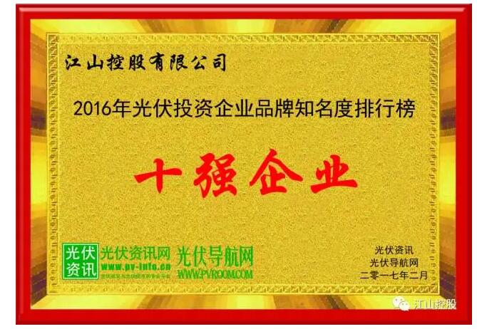 江山控股荣获“2016年光伏投资企业品牌知名度”十强殊荣