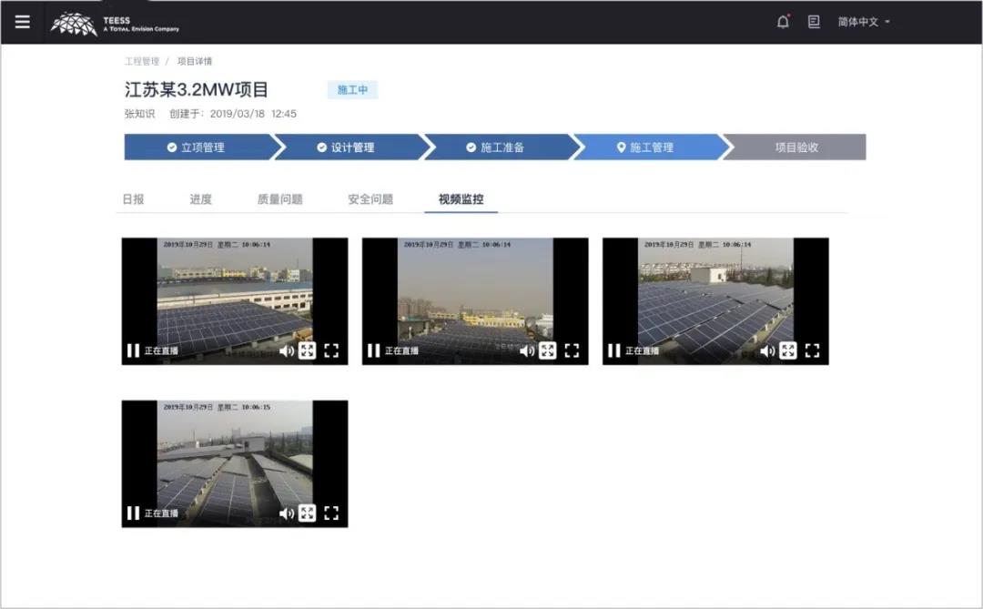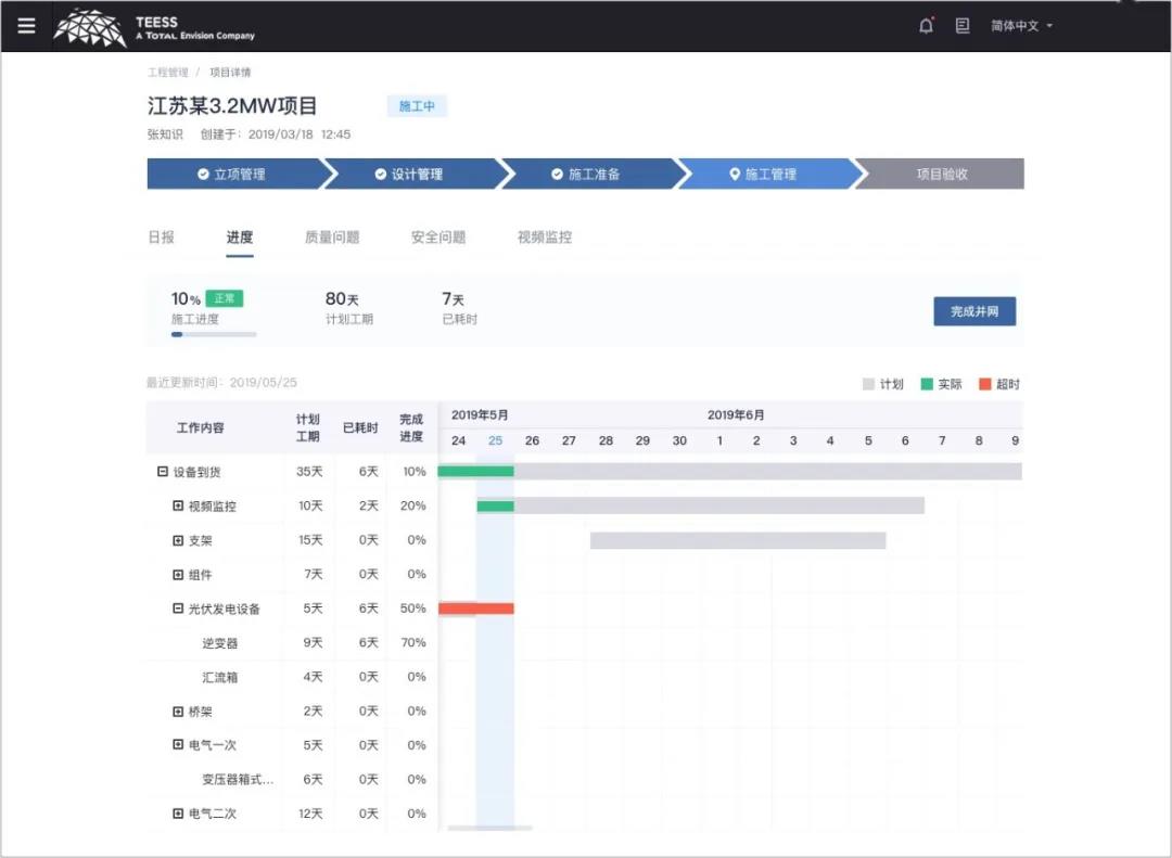 EntelligentTM泰思云的EPCM模块,可提供一站式光伏EPC解决方案,通过主线管理、数字化日报、视频监控、施工运维一体化,提高项目管理效率、把控项目进度、提升施工质量、降低施工安全风险。从立项、设计、施工准备、施工到验收,信息化管理与在线审批流程,提升全流程管理效率。