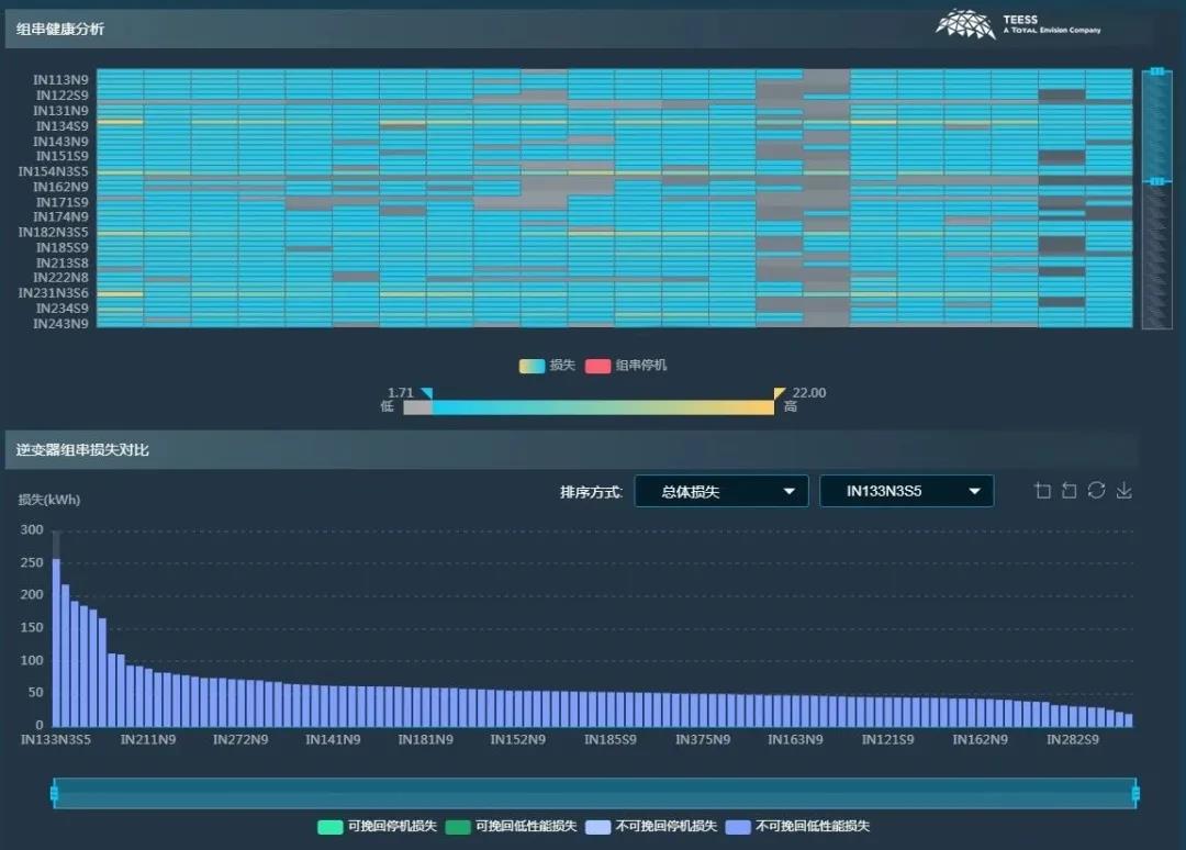 EntelligentTM泰思云的Ensight模块,采用国内外领先的损失分解算法,精细化分析电站损失原因,基于数据分析进行故障预警,智能识别性能异常,提前告知,并自动产生预防性运维建议,做到有的放矢的精准运维,最大化投入产出比,有效保障电站效益。