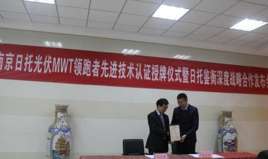1月19日,在南京举办的“日托MWT领跑者先进技术认证授牌暨日托鉴衡深度战略合作签署仪式”上,南京日托光伏科技股份有限公司(以下简称“日托”)的MWT多晶电池和组件技术获得北京鉴衡认证中心(CGC)颁发的光伏组件“领跑者”先进技术产品认证证书,同时双方为加强在新能源方面的合作,签署了深度战略合作协议。
