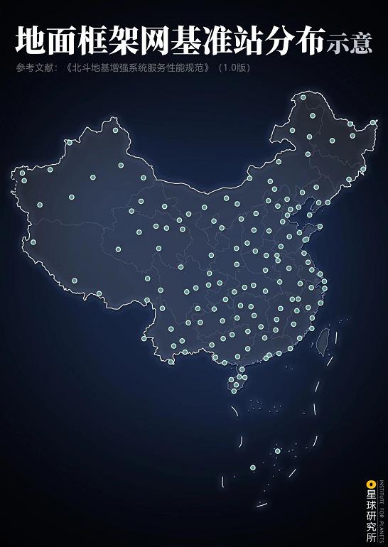 (北斗地基增强系统包括框架网和区域加强密度网两部分,其中框架网基准站共155个,区域加强密度网基准站超过2700个,下图为框架网站点分布示意,制图@王朝阳&郑伯容/星球研究所)