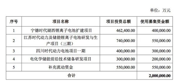 根据公告,在拟定增募资的200亿中,125亿用于3个项目共计52GWh的产能扩张,20亿用于储能研发项目,55亿用于补充流动资金。3个项目全部达产后预计贡献收入342.89亿,净利润30.45 亿。同时公告拟以自筹方式不超过100亿投资宁德车里湾项目,总设计产能约45GWh。