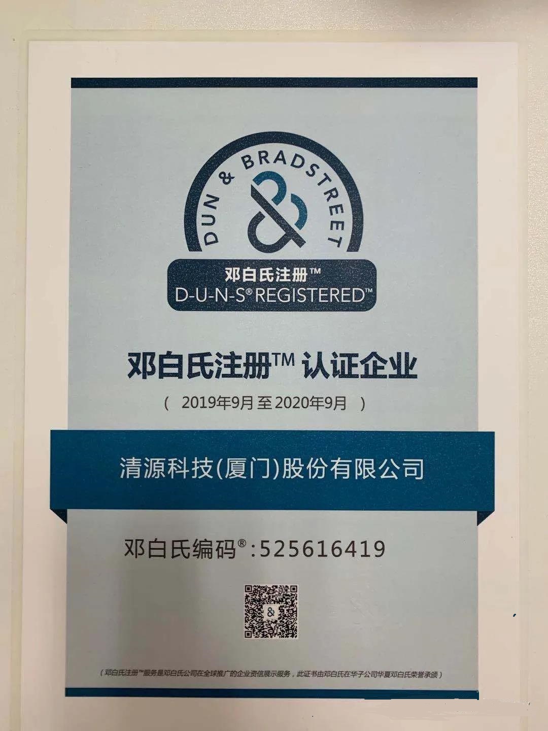 清源股份邓式编码为525616419,此次能成为邓白氏注册认证企业,是对清源股份的诚信度、真实性与风险管控能力的认可。