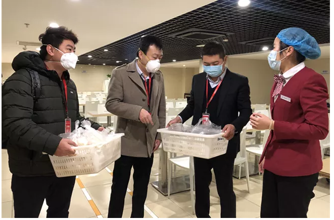 人员聚集的员工餐厅,是复工后疫情防控最大的“风险点”。集团每日两次严格按照餐厅消毒标准对操作间进行全面消毒消杀,采取分时段分餐非现场方式安排员工工作餐,由各部门指定专人取餐、发放,员工在工位用餐,有效避免了人员密集接触带来的风险。同时,在各楼层放置了分类垃圾桶并下发工作提示,要求员工做好工作期间废弃口罩、餐盒等垃圾分类工作。